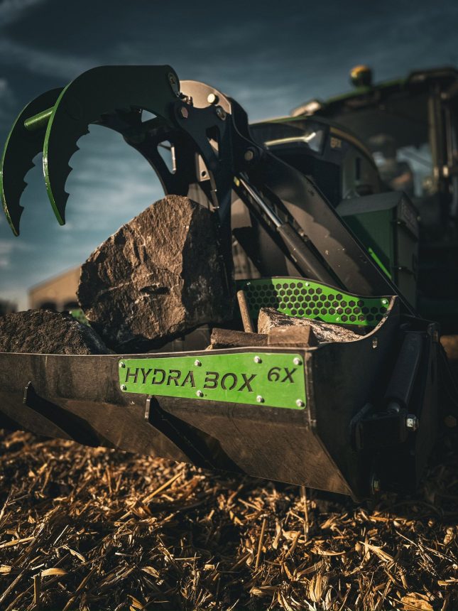 Entirely constructed of high-strength steel & fully powered by your tractor’s hydraulic system, our new hydraulic on-board rock grapple system has the ability to lift 4,000lb rocks out of the ground in seconds – all controlled from the comfort of the cab by an easy to use remote control. All Hydrabox assemblies are mounted onto the front of your tractor using one of our custom-made brackets that bolt right onto the frame.