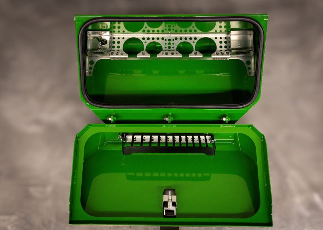 The TB8 has a universal bracket system which adapts to the OEM bracket on the machine. No additional mounting brackets required. Just four bolts and it’s on. This lockable, durable toolbox is a fantastic addition to any machine! Save time. Save money. Get yourself a TB8 toolbox.